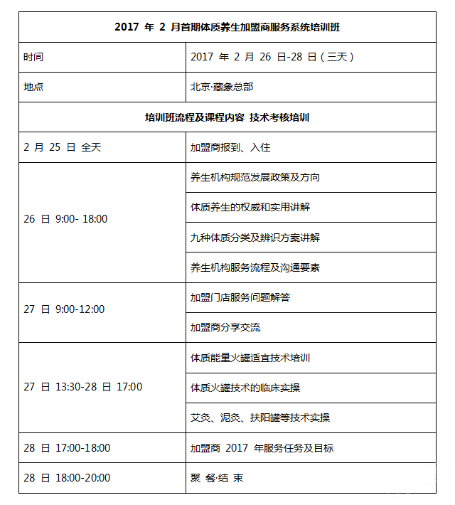 為了共同探討?zhàn)B生機(jī)構(gòu)規(guī)范發(fā)展的方向,促進(jìn)產(chǎn)業(yè)規(guī)范化運(yùn)營;強(qiáng)調(diào)體質(zhì)養(yǎng)生的科學(xué)性、重要性,解決在日常運(yùn)營中遇到的各種問題;提高市場(chǎng)服務(wù)能力,提高健康養(yǎng)生機(jī)構(gòu)的服務(wù)水平。現(xiàn)藏象品牌管理公司決定開展首期體質(zhì)養(yǎng)生加盟商服務(wù)系統(tǒng)培訓(xùn)班。在此誠摯邀請(qǐng)各位加盟合作商屆時(shí)親至。